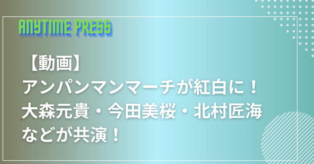 2025年の『NHK紅白歌合戦』にアンパンマンが登場し、『アンパンマンのマーチ』を披露し、話題です。 そこで今回の記事では 2025年『NHK紅白歌合戦』の「アンパンマンのマーチ」の動画を見たい。 などの疑問にお答えしますね。 ぜひ最後まで読んで下さいね... -