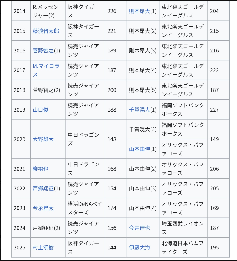 以下2014年~2025年までのセ・リーグ、パ・リーグの奪三振王です。