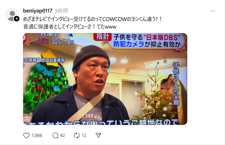 2025年12月24日に【めざましテレビ】で芸人のCOWCOWの善しさんが保護者としてのインタビューを受けていたのでは?と話題です。